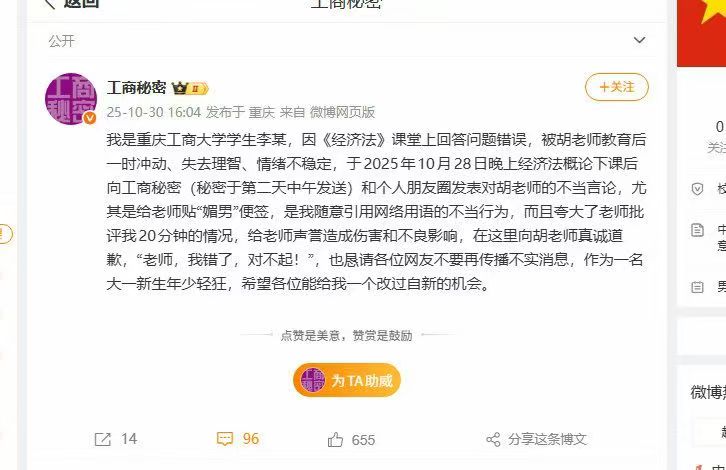 10月30日,重庆工商大学学生李某匿名发帖称老师胡某“刻薄媚男”一事引发广泛关注。