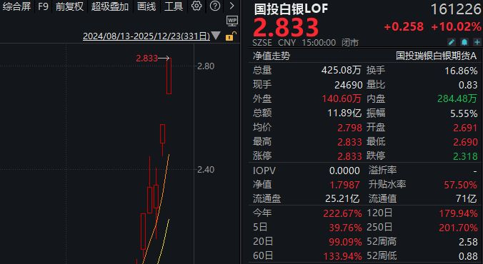 12月23日,国投白银LOF又涨停了,截至收盘,场内价格来到2.833元,相较最新A份额净值1.7987元溢价57.5%,再创阶段新高。